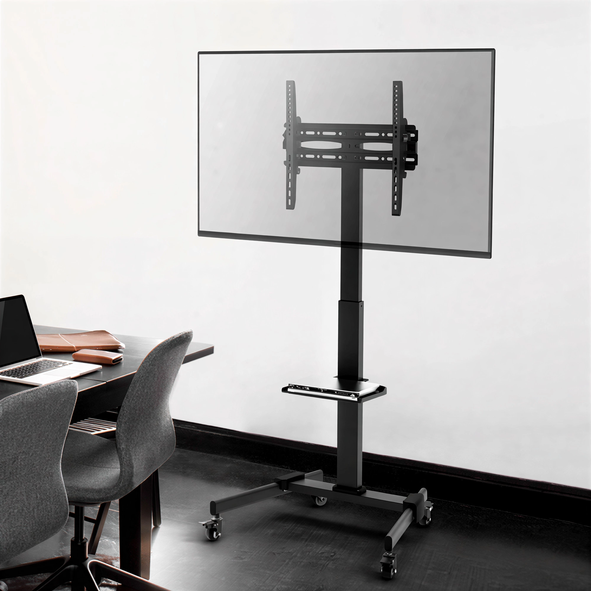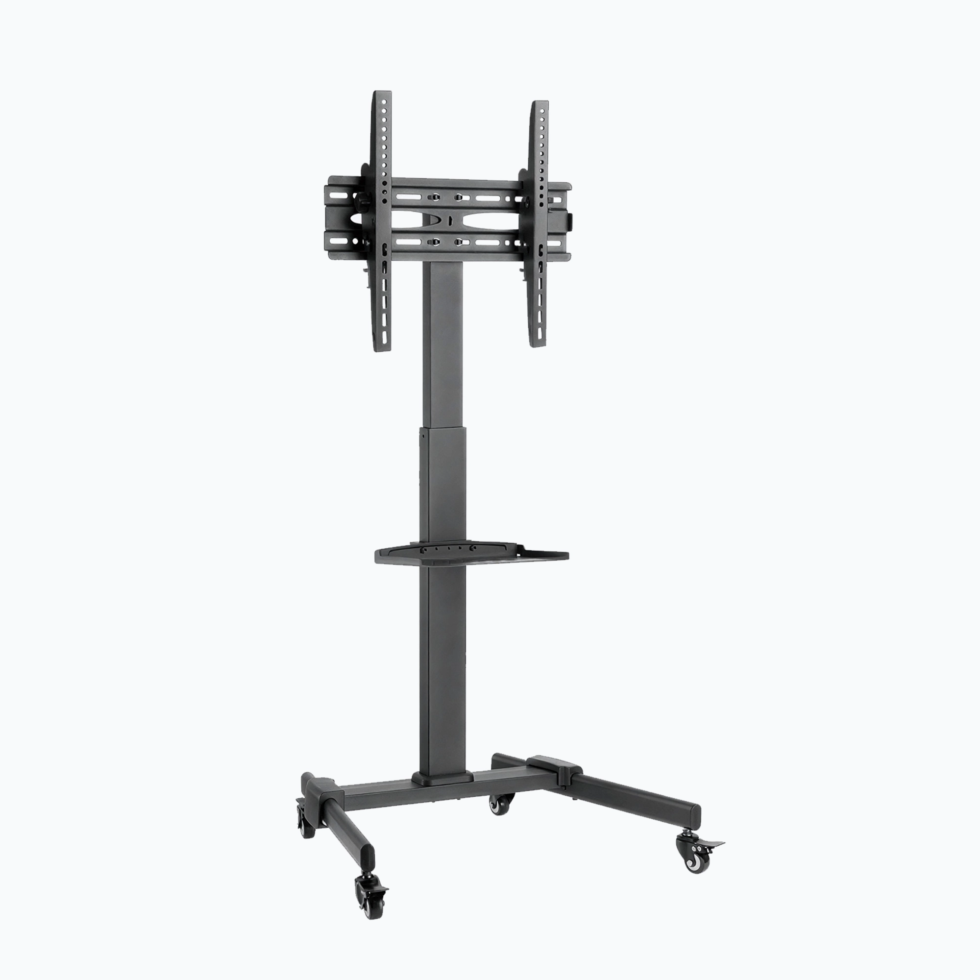A versatile height-adjustable TV cart with a 1020–1320 mm telescopic column, toolless ±10° tilt, quick-release spring lock, lockable rolling casters, equipment shelf, and integrated cable management ideal for homes, offices, conferences, and commercial spaces.