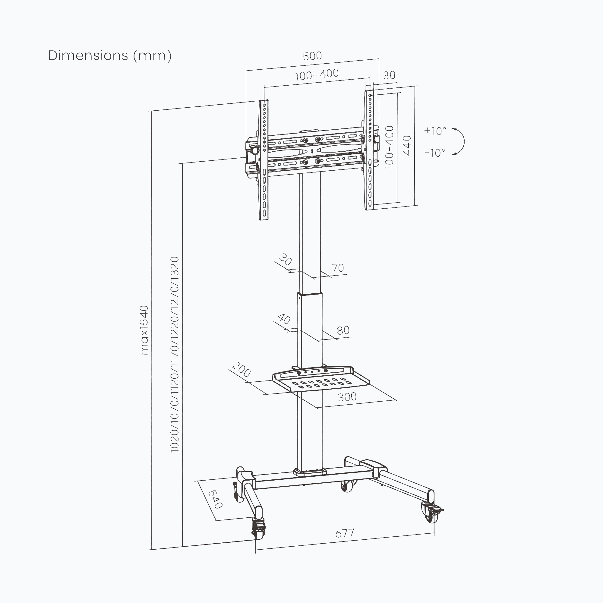 • Dimensions (W x H x D): 677 × 540 × 1240–1540 mm